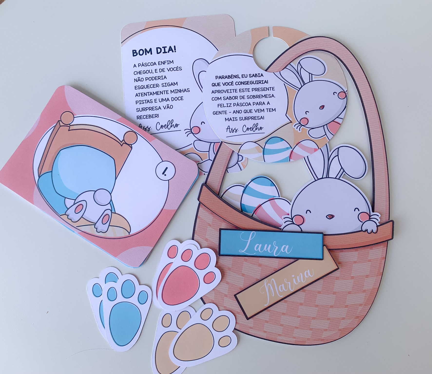 01 cestinha para pendurar na porta com a primeira pista e cartinha do Sr Coelho;